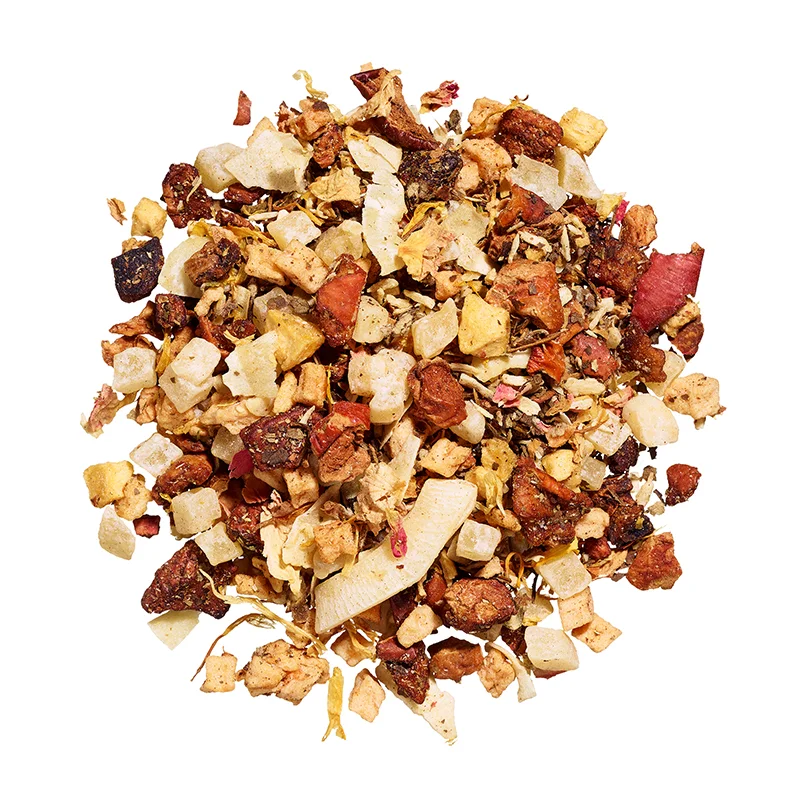 Cremig-fruchtig wie der Cocktail-Klassiker mit dem typischen Geschmack nach Kokosnuss und Ananas – ein Genuss, der dem Gaumen schmeichelt. Dieser Tee ist als „besonders mild“ gekennzeichnet, da er keinen Hibiskus enthält.