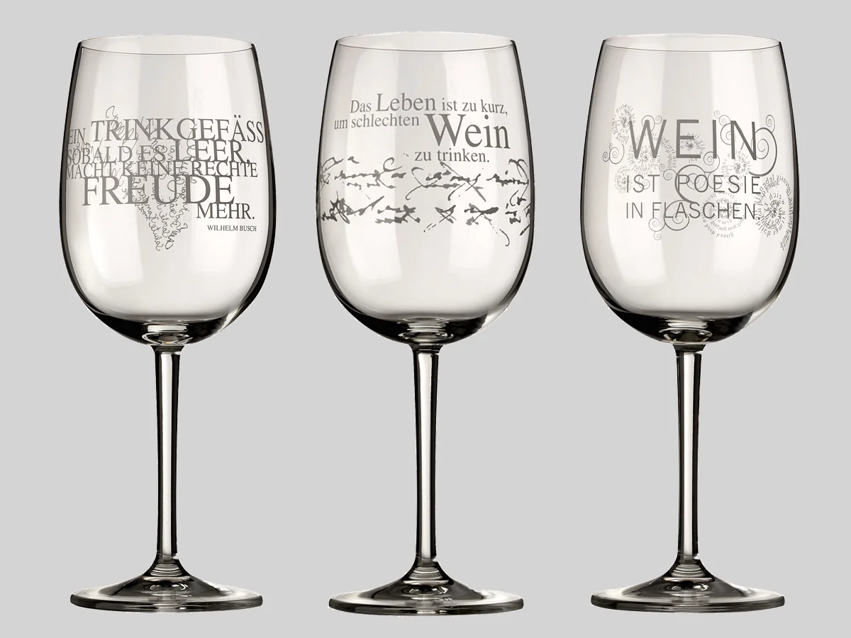Hochwertiges Glas und feiner Stiel, ein zarter Fuß, gekrönt von inspirierender Poesie und humorvollen Botschaften, die zart auf dem Glas von Räder erscheinen.